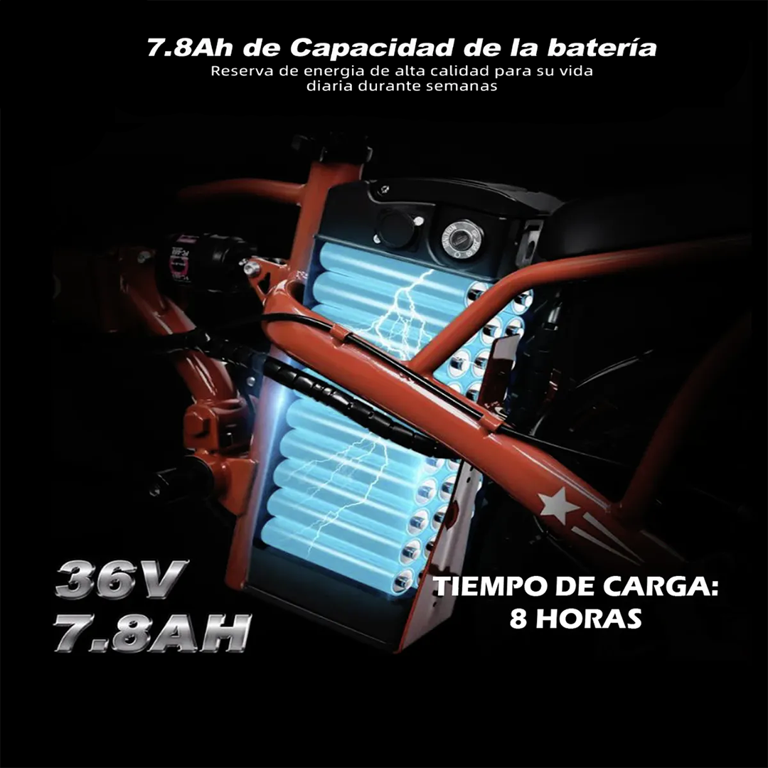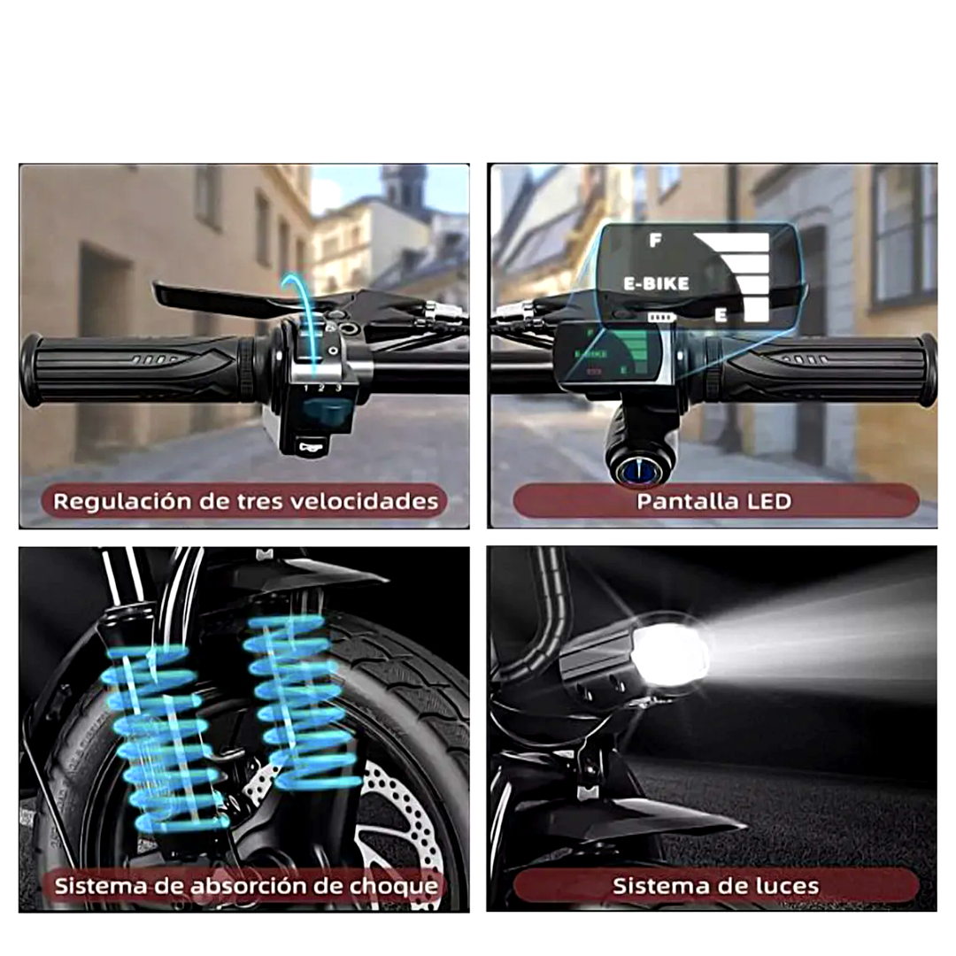 Bicicleta eléctrica: Está diseñada con una robusta estructura de «aleación de aluminio 6061» y puede soportar un peso igual o inferior a 120 kg. Con un peso aproximado de 22 kg, es una e-bike superligera y plegable, fácil de transportar. El manillar de esta económica e-bike es fijo y dispone de una pantalla digital LED para comprobar el nivel de potencia. La parte delantera de la bici eléctrica está equipada con una luz LED que ilumina la ruta por la noche, proporcionando una garantía de seguridad. La bicicleta eléctrica está equipada con neumáticos de vacío de 14 pulgadas para una conducción suave y segura.