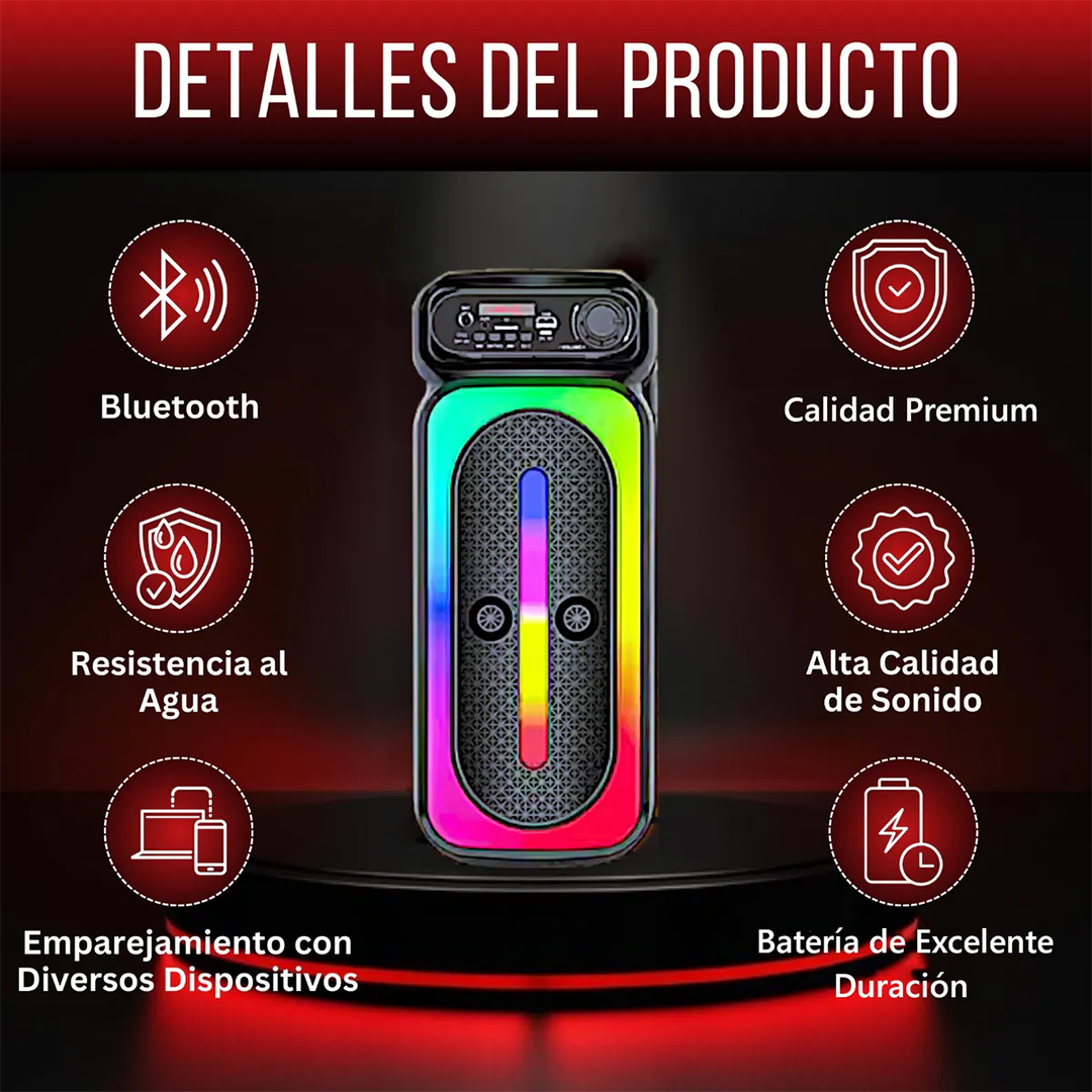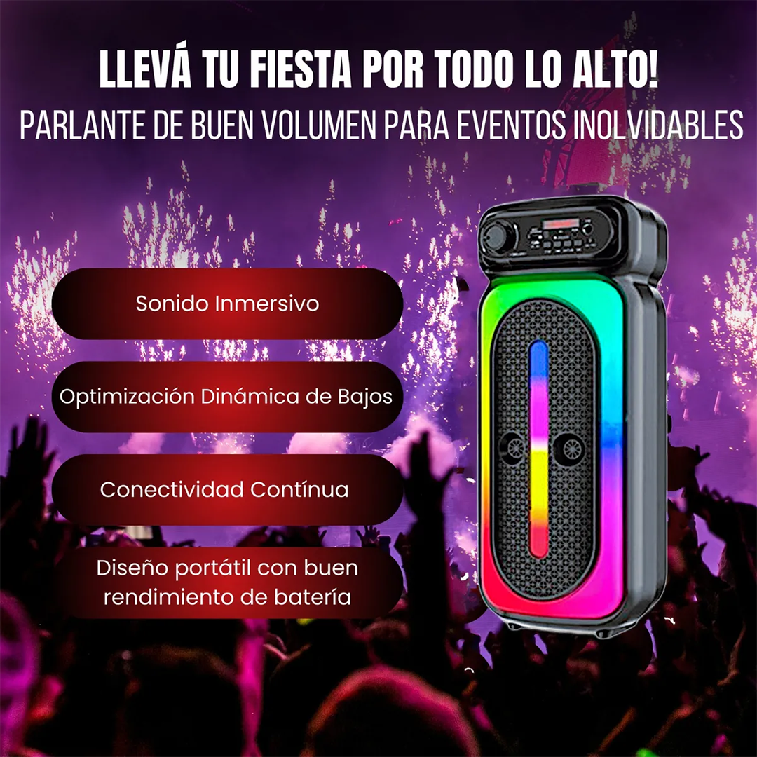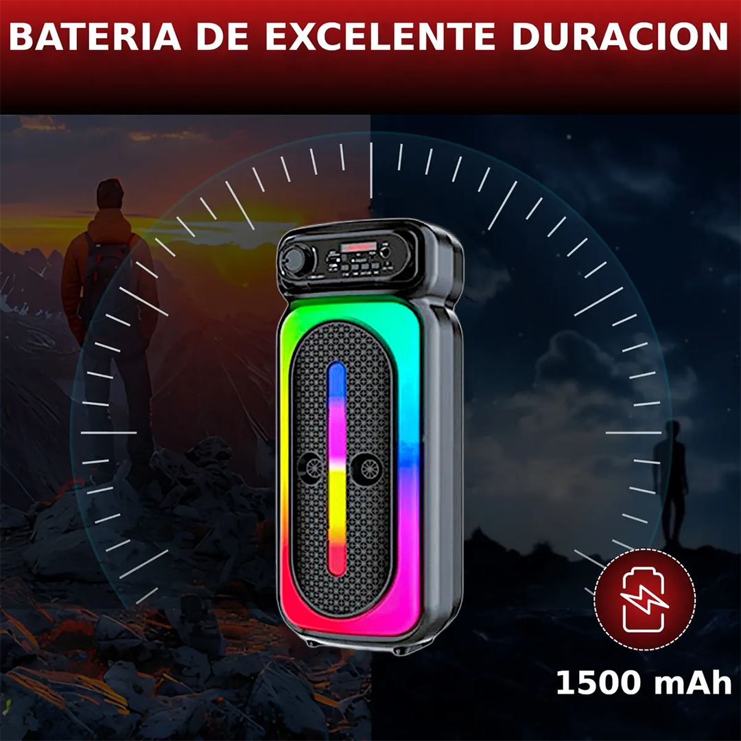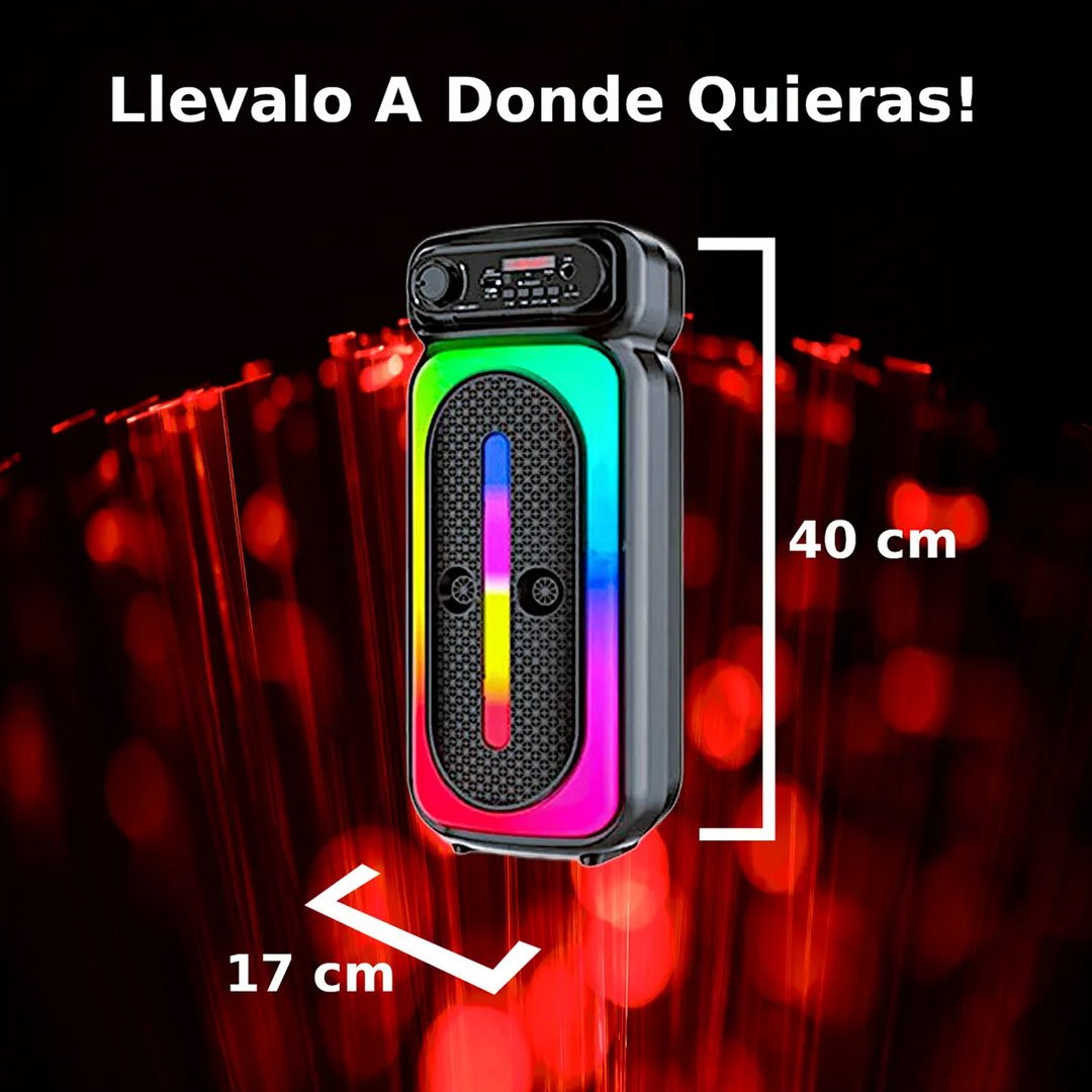 Combina un sonido potente y claro con una conectividad versátil, gracias a su woofer de 4” y Bluetooth 5.0. Ofrece múltiples entradas (USB, AUX, SD y micrófono), iluminación LED RGB sincronizada con la música, y una batería de larga duración (hasta 10 horas), todo en un diseño portátil ideal para interiores o exteriores. Además, incluye función karaoke con micrófono, convirtiéndolo en la opción perfecta para animar cualquier evento o reunión.