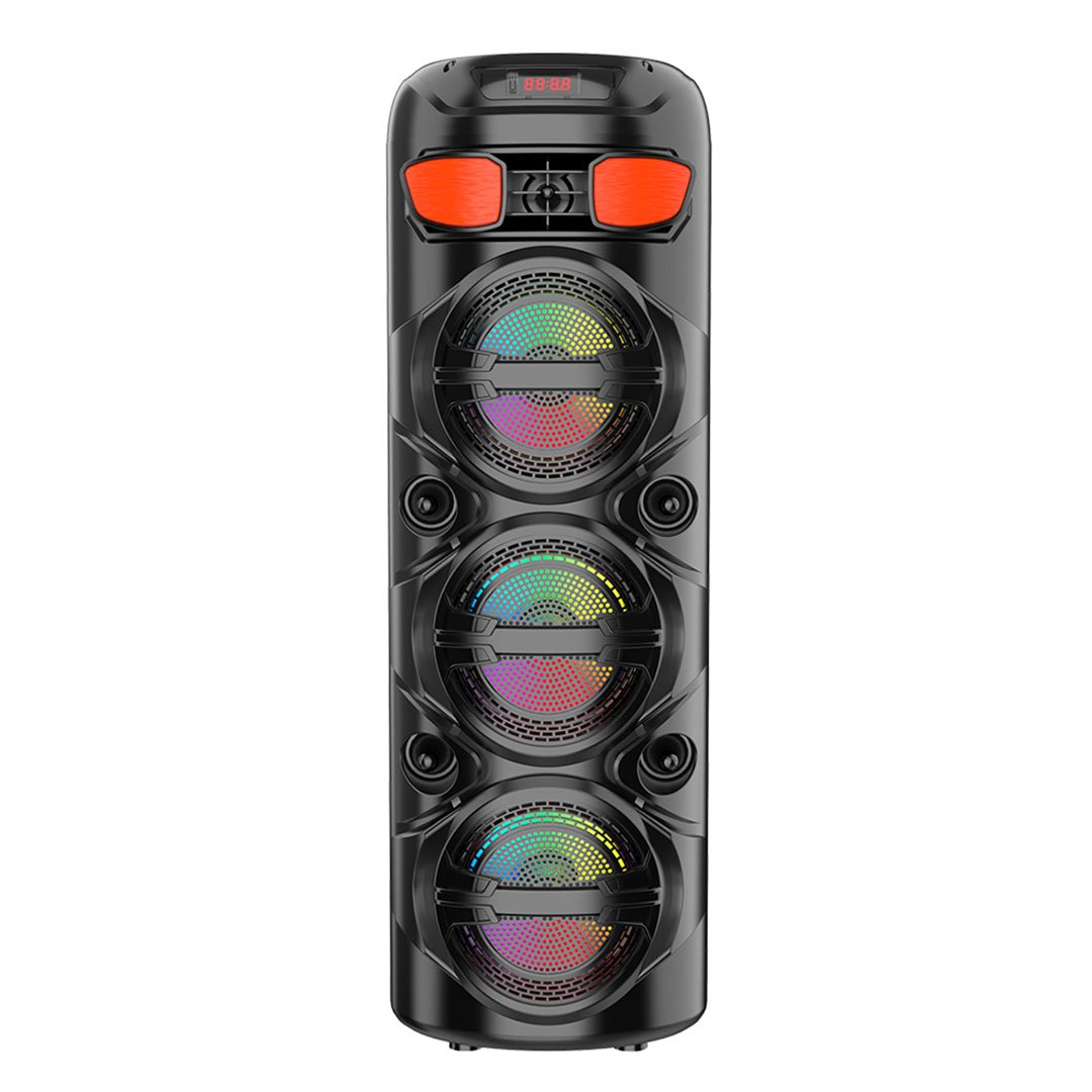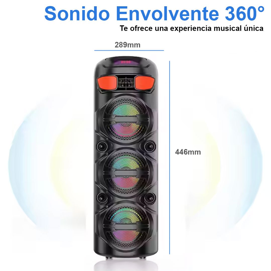 Soporta Bluetooth v5.1 o v5.3, y permite conexión mediante USB, tarjeta TF/SD, AUX y radio FM. Además, incluye modo TWS para emparejar dos unidades y alcanzar un sonido estéreo más amplio. Integra micrófono y puede funcionar con micrófono inalámbrico, haciéndola perfecta para karaoke o anuncios.