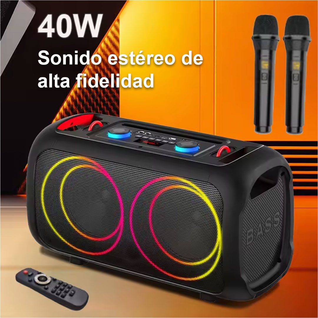 Viene con dos micrófonos inalámbricos incluidos, permitiendo sesiones de karaoke desde el primer momento. Además, incluye control remoto para manejar la reproducción, volumen y modos sin complicaciones.