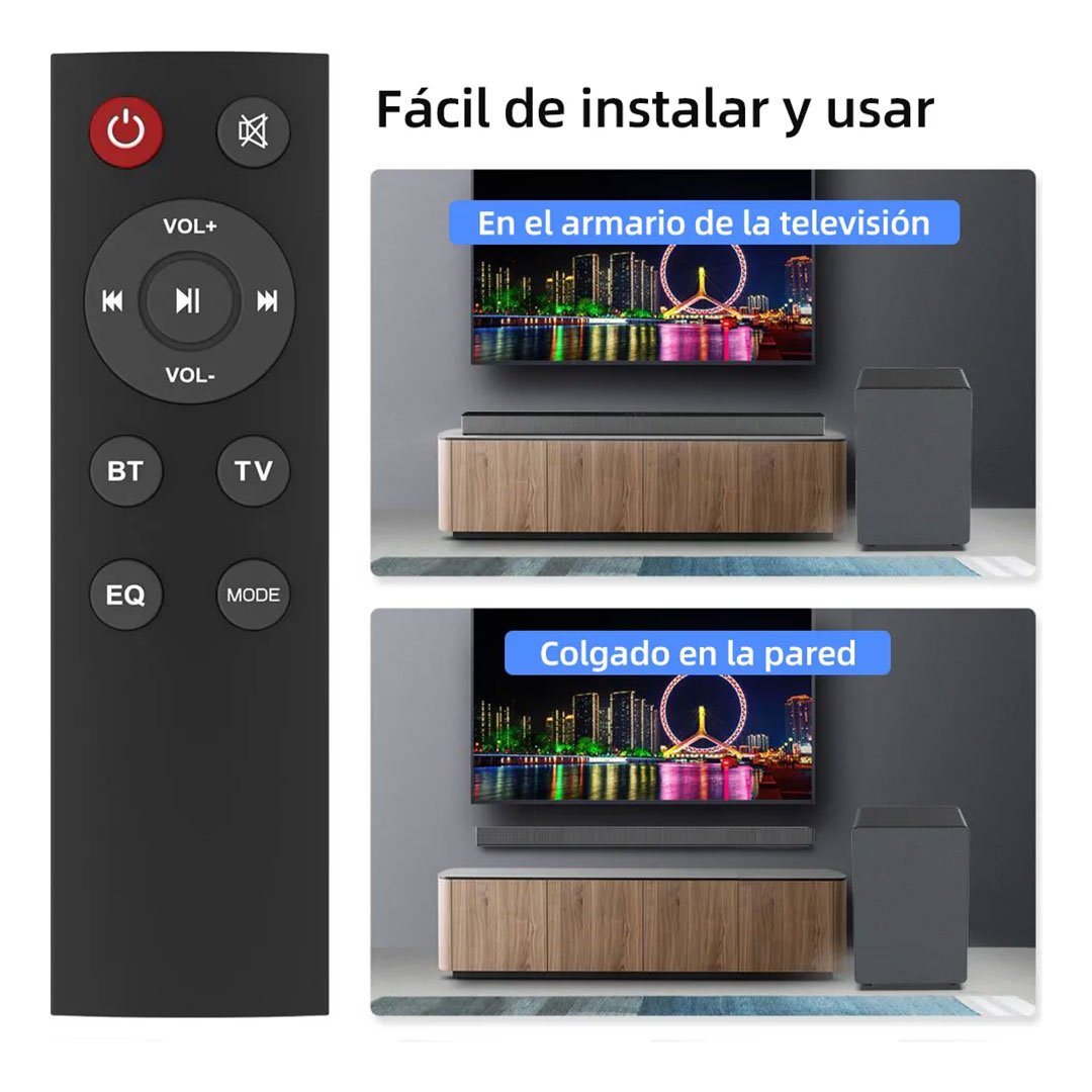 El altavoz de barra viene con un cable de audio de 3,5 mm, mando a distancia y opciones flexibles de conectividad inalámbrica y por cable para tu televisor. Es fácil de configurar y perfecto tanto para entusiastas de la tecnología como para principiantes.